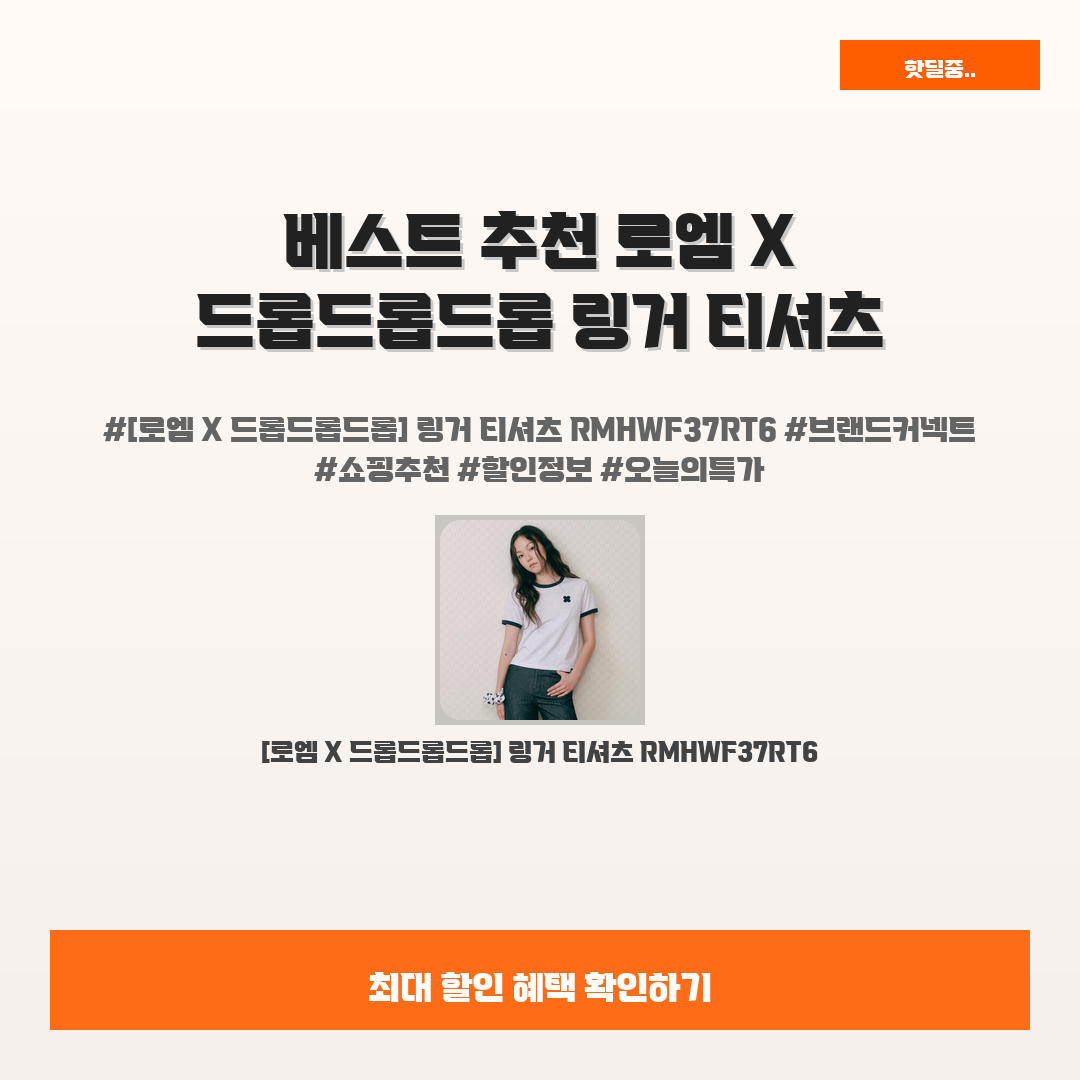 🛍️ 이 포스팅은 네이버 쇼핑 커넥트 활동의 일환으로,판매 발생 시 수수료를 제공받습니다.오늘 소개할 제품은 단연코정말 매력적이고 스타일리시한 아이템이에요!요즘 뭘 입을지 고민하는 분들을 위해,"[로엠 X 드롭드롭드롭] 링거 티셔츠 RMHWF37RT6"는 그야말로 완벽한 선택이랍니다!이 티셔츠는 착용할 때마다 느껴지는 편안함과 스타일 덕분에 여러 번 입고 싶어질 거예요.심플하면서도 개성 있는 디자인이어서 어떤 스타일에도 잘 어울려요!진짜 이 링거 티셔츠 한 장이면, 어떤 자리에서도 후회 없는 선택이 될 거라 확신해요.지금 딱 확인해보세요, 진짜 추천합니다!!※ 이거 진짜 제가 직접 써보고 쓰는 리뷰예요 광고 아님!![로엠 X 드롭드롭드롭] 링거 티셔츠 RMHWF37RT60% 39,900원39,900원r..