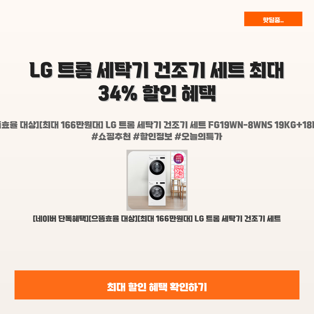 🛍️ 이 포스팅은 네이버 쇼핑 커넥트 활동의 일환으로,판매 발생 시 수수료를 제공받습니다.오늘 소개할 제품은 단연코!바로 최고의 선택, LG 트롬 세탁기 건조기 세트에요!요즘 세탁과 건조의 번거로움 때문에 고민 중이신가요?"[네이버 단독혜택][으뜸효율 대상][최대 166만원대] LG 트롬 세탁기 건조기 세트 FG19WN-8WNS"로 그 고민을 단번에 해결해보세요!세탁기와 건조기의 환상 조합이 여러분의 삶을 한층 더 편리하게 만들어 줄 거예요. 이 34% 할인 혜택까지 챙기면 가성비도 대박이죠!친구들이 부러워할 만한 트롬 세탁기 건조기 세트, 지금 바로 확인해보세요. 후회 없는 선택이 될 거예요!※ 이거 진짜 제가 직접 써보고 쓰는 리뷰예요 광고 아님!![네이버 단독혜택][으뜸효율 대상][최대 166만원..