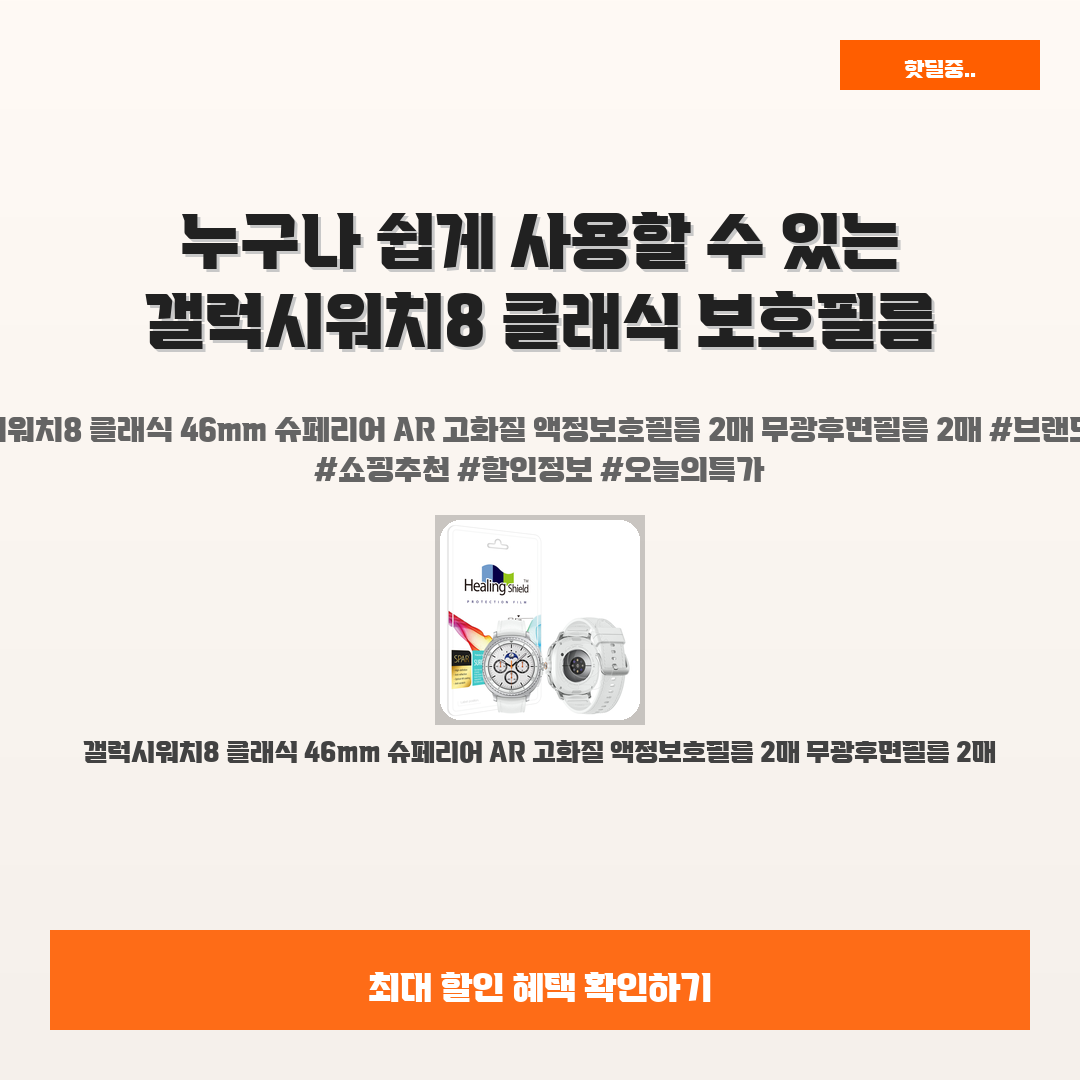 🛍️ 이 포스팅은 네이버 쇼핑 커넥트 활동의 일환으로,판매 발생 시 수수료를 제공받습니다.오늘 소개할 제품은 단언컨데,,바로 갤럭시워치8 클래식 46mm 슈페리어 AR 고화질 액정보호필름입니다!혹시 스마트워치의 아름다운 화면을 보호하고 싶어서 고민하고 계신가요?"갤럭시워치8 클래식 46mm 슈페리어 AR 고화질 액정보호필름 2매 무광후면필름 2매"은 그런 여러분을 위한 완벽한 선택입니다!이제는 소중한 기기를 긁힘이나 오염으로부터 안전하게 보호할 수 있습니다. 고화질 필름으로 화면의 선명도를 유지하면서도, 무광 필름이 후면을 깔끔하게 유지해줍니다.여러분도 이 브랜드 커넥트 상품의 매력을 느껴보세요!최상의 가성비로, 14,800원에서 10% 할인된 13,320원에 만나볼 수 있는 기회, 절대 놓치지 마세요..